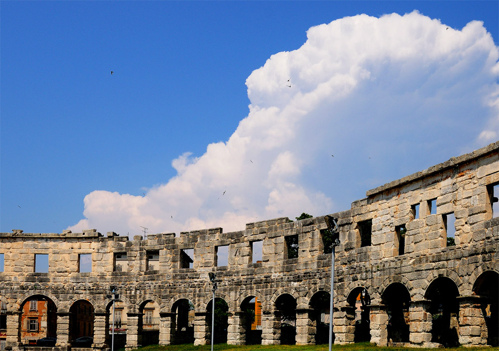 Древний амфитеатр в хорватской Пуле (насколько я помню, шестой по размеру из сохранившихся) менее известен, чем римский Колизей. Но чем он хуже? Да и с погодой повезло тогда... |